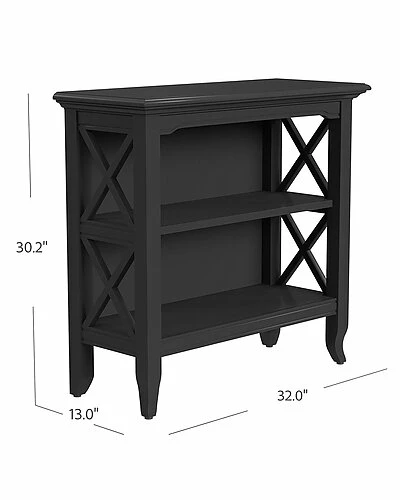 - This stylish bookcase is a wonderful accent in a living room, family room, hallway, kitchen, childs room or home office. Made for smaller spaces, versatility is one of its key attributes. Crafted from select hardwood solids and wood products, it features X-shaped side supports and a handsome black finish. The top and fixed shelves are made from veneer.