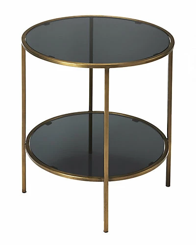 - Design details: Enhance your living room, bedroom or office with this modern two-tiered round end table. Forged from iron, its antique gold finished frame supports a black glass top and bottom shelf.