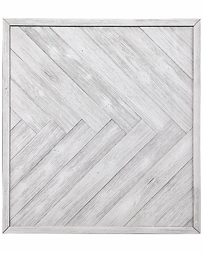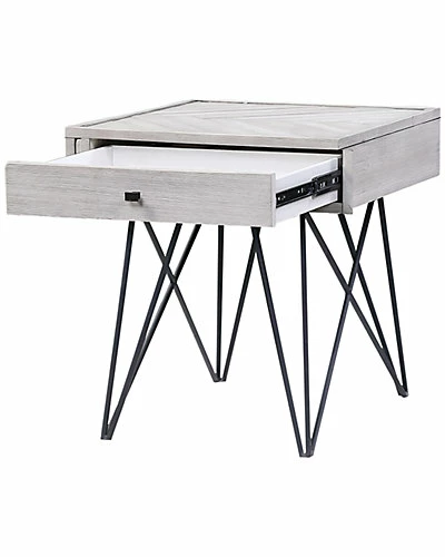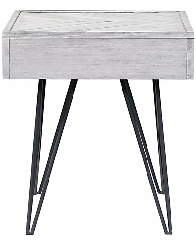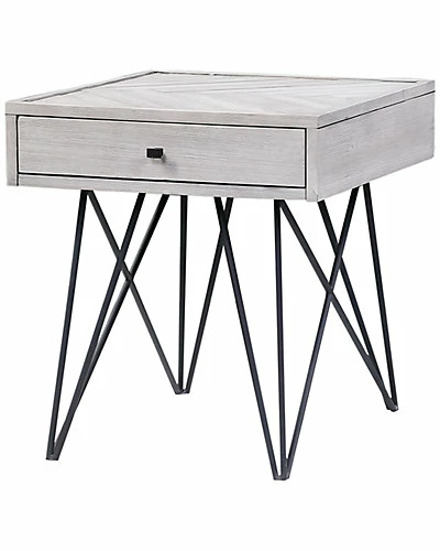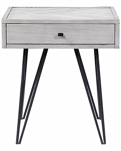 - Design details: The geometric angles of the dark metal hairpin legs add an architectural element to this adorable End Table! The squared top has a wonderful chevron pattern, and has been finished all the way around in a pale Aspen Court Herringbone Light Rub finish. A large drawer adds that bit of needed storage, for your pens, papers, and whatnots. Use alone, or with the coordinating Cocktail and Console for a unified yet eclectic look.