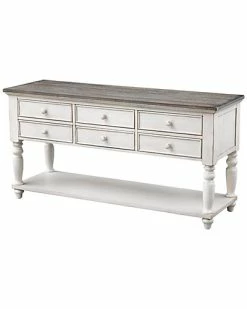 - Design details: A plank style top with a natural aged patina sets off the paler Bar Harbor Cream finish that coats our Six Drawer Console Table, a lovely combination! The six roomy drawers above provide ample storage space for everything from your table linens and serving pieces, to your pens and art supplies, while the full lower shelf below is perfect for baskets or books. With turned legs and feet, matching hardware and extended drawer glides, this beautiful Console is the perfect choice for your dining room, den or foyer.