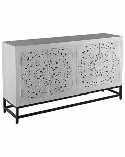 - Solid Mango Frame. Black powder coated iron base. 4 Doors with Hand Carved Scrollwork Design. Two Interior Fixed Shelves. Cord Management. Adjustable Levelers. Stunning hand carved panels form the four doors of this majestic Credenza, and are perfectly framed by the smooth linear shape of the body. Coated in a soothing Floral White Wash, this Credenza is perched atop a dark open tubular framework for a subtle contrast. With a spacious surface for display, and a roomy shelved interior complete with a built in cord management system, this Credenza will be a welcome addition as well as a sensational focal point for any decor.