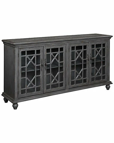 - Design details: With a substantial air, this media cabinet is unassuming, but beautifully built. The Joplin Texture Grey finish is tactile and neutral. The four doors have a cloisonne-style treatment over the glass inserts. Large decorative hardware and an interior shelf contribute to the classic style.