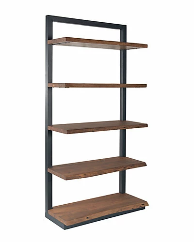 - Design details: Wide, live edge planks of solid Acacia wood in a vibrant Sequoia Light Brown finish appear to float in mid-air on our five-shelf bookcase. Yet, held aloft by metal brackets on a dark iron frame, youll have no worries about displaying your treasured photos and possessions.
