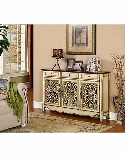 - Design details: The scalloped skirt goes across the front and wraps around the sides, setting the stage for the swirled cut-away panel facings on the three doors. Finished in Harvester Textured Cream and a dark rich wood tone top, this classic credenza will keep your serving pieces and candles close at hand in the three upper drawers, while providing a wonderful display area for larger items both inside and on the expansive surface.