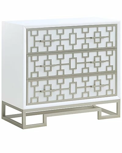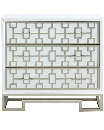 - White Case with Champagne Geometric Fretwork. Champagne Powder Coated Iron Base. 3 Drawers with Extended Drawer Glides. Adjustable Levelers. Bar Hardware in Champagne Finish. Easy Assembly – Just add Legs. Distinctive and glamorous, this stunning Three Drawer Chest will be a prized player in any setting. Geometric overlays in the rich Champagne Lights span the drawer fronts, and are set off by the crisp Dreamy White of the body and the matching custom linear hardware. Perched upon an open metal base which echoes the golden overlay patterns, this Chest is guaranteed to be a shining star for your decor!