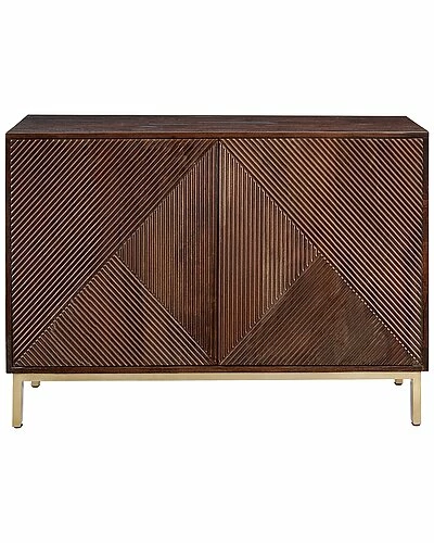 - Solid Acacia Frame. Gold powdercoated iron Base. 2 doors with upgraded european hinges. Hidden Finger Edge Door Hardware. One Fixed Interior Shelf. Adjustable Levelers. The brushed gold linear metal base and the deep Lenin Brown are beautifully paired on this mid-century inspired Cabinet. The rich wood tones radiate from the smooth surfaces of the expansive top and sides as they frame the two door fronts, which have a ridged textural design that comes together in a unique diamond design in the center for an intriguing visual. With a large shelved interior for storage, this stunning Cabinet will make a welcome addition for any room.