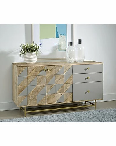 - Mango Wood. Gold Metal Base. Two Tone Finish. Geometric Accents. Asymetrical Configuration. One Fixed Interior Shelf. A visual delight. The two doors on his stunning Credenza have a quilted pieced together quality which combine the natural wood tones of the Diversion Natural and Cement grey into an intricate and eye-catching design. Three drawers go down the side continuing the color theme, and are accented by diamond shaped golden hardware to tie into the open metalwork base. A wonderful Credenza that will be a focal point for any decor.