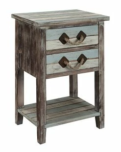 - Design details: After a long day at the beach, it’s so nice to curl up in your favorite chair, and our accent table finished in weathered Islander Multicolor should be right there beside you. With two drawers and a shelf on the bottom for books and those magazines you’ve been wanting to read, plus room on the top for that cool beverage, you’ll have all you need right at your finger tips!