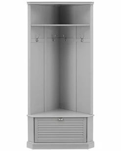 - Keep your home’s entryway tidy and organized with the Ellison Corner Hall Tree. Featuring louvered accents on the drop-down cabinet door and raised paneling on the back, this hall tree gives home organization a classic look. This hall tree’s corner-hugging design makes it the perfect coat rack and landing zone for any size entryway. With hooks for hats and a lower cabinet for shoes, the Ellison Corner Hall Tree offers stylish storage wherever it goes.