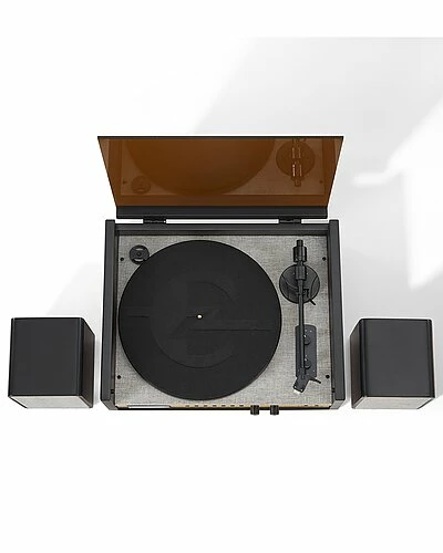 - Design details: give your record collection a level up in technical sophistication with the coda shelf system. this sleek system was designed with high-end, modern interiors serving as inspiration. pick out your favorite record, choose between three speeds (33 1/3, 45, & 78 rpm), drop the fully manual tone arm with mounted moving magnetic cartridge onto your vinyl, and start listening to music the way the artist intended through matching stereo speakers. when you’re not spinning vinyl on this instagram-worthy set-up, lower the dust cover and keep it clean while looking chic. want a break from analog? connect to the built-in bluetooth receiver and stream your favorite playlist or switch over to the am/fm radio to tune in to your local public station.