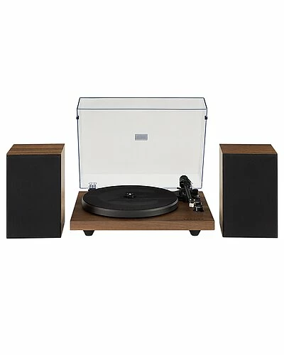 - Design details: the crosley c62 was designed to be a ready-to-go-sounds-darn-good-straight-out-of-the-box turntable system that doesnt break the bank. this fully manual two-speed (33 1/3 & 45 rpm) turntable sports an mdf plinth wrapped in a faux walnut veneer that would fool the best of lumberjacks. the matching mdf speakers look just as good as the turntable and each rock a mid-range speaker and tweeter. the matte black aluminum tone arm has an adjustable counterweight and comes pre-mounted with a moving magnet cartridge. of course, the cartridge is mounted with the standard 1/2 mount, so you can always upgrade your cartridge/stylus combo as your vinyl collection grows. the record sits on a heavy steel platter that helps keep the c62 firmly planted on its three vibration control feet. take that, rogue vibrations! the super minimal, two-knob design makes it easy to switch speeds, crank up the volume and switch to the built-in bluetooth receiver if you want to stream music from your favorite digital playlist. whether you live in a sweet nyc loft or a teenage bedroom filled with angst, the c62 can hold its own.