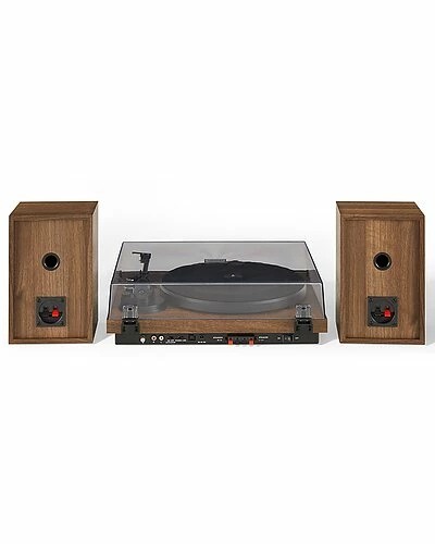 - box includes: turntable, turntable lid, turntable platter, turntable slip mat, 45 rpm adapter, tonearm counterweight, drive belt, cartridge alignment protractor, power adaptor, speakers, speaker wire x 2