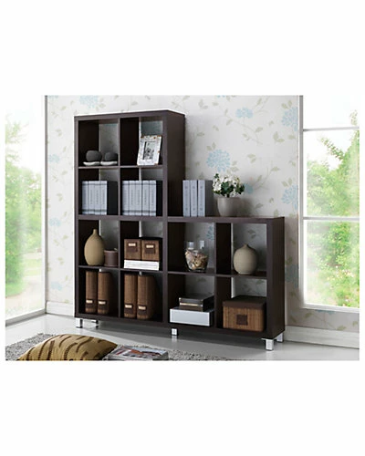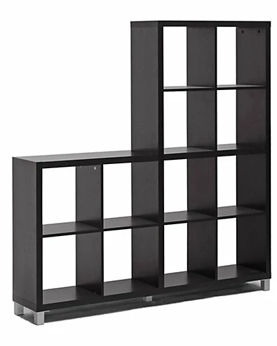 - Design details: engineered wood and faux wood grain paper veneer construction; 12 cube-based bookshelf, plastic legs with non-marking feet