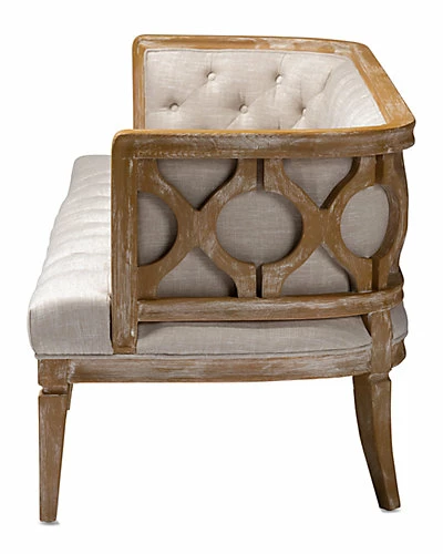 - Design details: Featuring a classic silhouette and antique finish, the Agnes sofa is an elegant addition to any space. Constructed from solid oak wood, the Agnes showcases a charming white-washed finish for an aged appearance. Beige linen fabric upholstery gives the piece an understated elegance. Inspired by traditional French furniture, the Agnes features button tufting on the sofa seat and back, as well as tapered legs. The wooden frame is crafted with a striking cut-out design on the back, making it ideal for placement in the center of a room. The Agnes sofa is made in China and will arrive fully assembled.