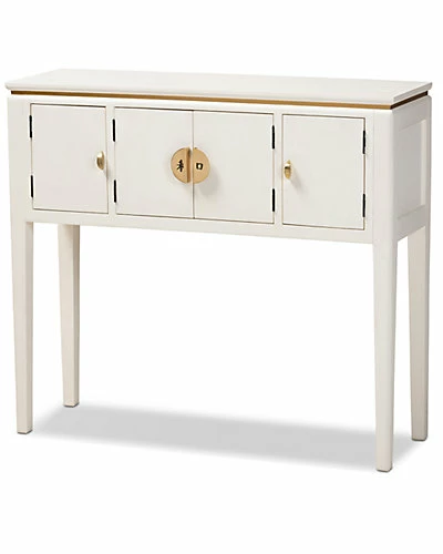 - Design details: Display your worldly treasures on the charming Aiko console table. Inspired by antique Japanese furniture, this console features clean lines and exquisite ornamentation. Its sturdy wood frame displays an elegant off-white finish that highlights the recessed detailing on the side panels, as well as the stunning gold-tone finish underneath the tabletop. Four doors open to reveal three spacious storage compartments. The side doors are fitted with simple gold-tone brass handles, while the middle doors feature striking gold-tone brass handles engraved with Chinese characters. Its slim silhouette makes it well suited for placement in a hallway, entryway, or living room. The Aiko console is made in Indonesia and requires assembly.