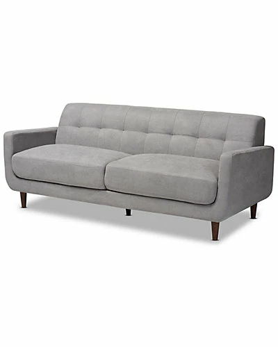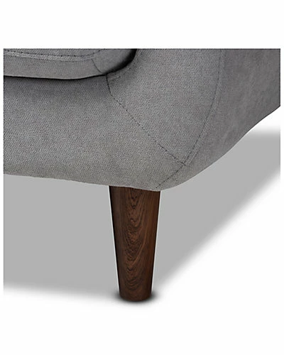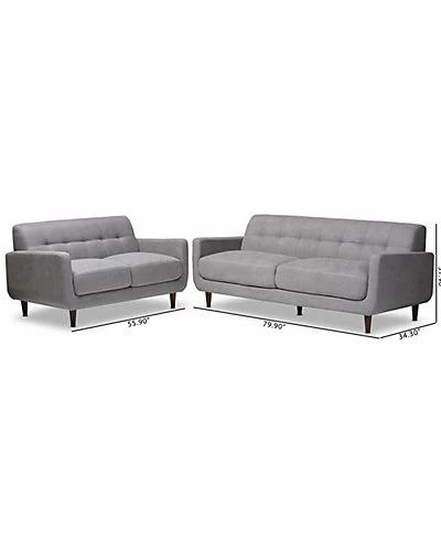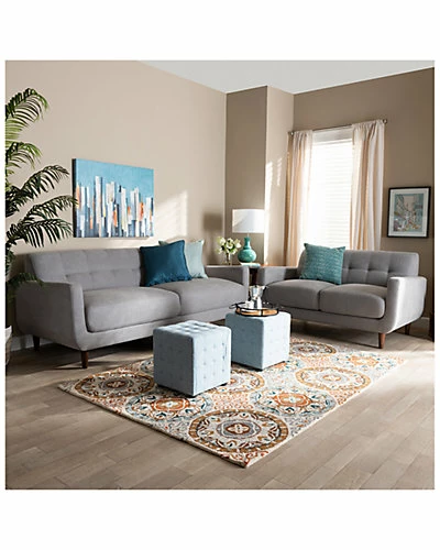 - Design details: Cool retro style marries modern comfort in the Allister living room set. Constructed from sturdy wood, the Allister set includes one sofa and one loveseat. Each piece is upholstered in a chic grey fabric that complements the walnut brown finish on the legs. Wide, plush cushions create comfortable seating. Influenced by mid-century design, the pieces feature biscuit tufting and tapered legs. The Allister living room set is made in Malaysia and requires assembly.