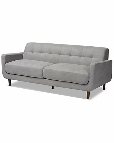 - Design details: Cool retro style marries modern comfort in the Allister sofa. Constructed from sturdy wood, the Allister is upholstered in a chic grey fabric that complements the walnut brown finish on the legs. Wide, plush cushions and the slanted back provide ample seating comfort. Influenced by mid-century design, the Allister features biscuit tufting and tapered legs. Pair this sofa with the Allister loveseat to complete the look. The Allister sofa is made in Malaysia and requires assembly.