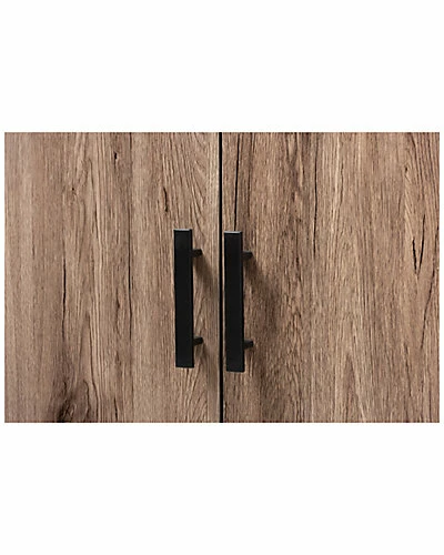 - Design details: Clean lines and a display of natural wood grains make the Arend bookcase a cool addition to any space. This solid MDF wood bookcase is fitted with two open shelves that provide space for your favorite books and knick-knacks. Additional storage space is provided by two shelves concealed behind a pair of doors. A stunning oak finish showcases the natural grain patterns of the wood, giving the piece a rustic touch. Dark ebony wood legs and black metal handles complete the look. The Arend bookcase is made in Malaysia and requires assembly.