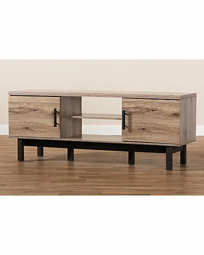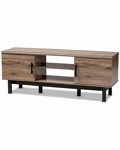 - Design details: Clean lines and a display of natural wood grains make the Arend TV stand a cool addition to any space. This solid MDF wood stand is fitted with two open shelves to store DVD players, game consoles, and more. Additional storage space is provided by four shelves concealed behind a pair of doors. A stunning oak finish showcases the natural grain patterns of the wood, giving the piece a rustic touch. Dark ebony wood legs and black metal handles complete the look. The Arend TV stand is made in Malaysia and requires assembly.