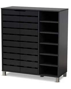 - Design details: Keep your shoe collection organized and easily accessible with the Shirley shoe cabinet. Fitted with two doors, the Shirley features six concealed shelves with storage space for up to 18 pairs of shoes. Slits are embedded within the doors to enable air circulation and prevent mold growth on your shoes. Six open shelves on the right side provide additional storage space for 6 pairs of shoes. Constructed from engineered wood, the Shirley showcases a dark grey finish that complements the clean, contemporary design. Grey plastic feet complete the look. The Shirley shoe cabinet is made in Malaysia and requires assembly.