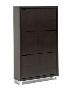 - Design details: engineered wood and faux wood grain paper veneer construction; three storage compartments each fit six pairs of shoes comfortably for a total of approximately eighteen shoe slots