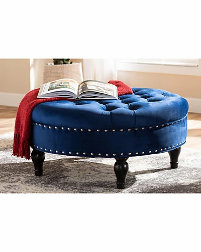 - Design details: Give your space an elegant upgrade with the Palfrey ottoman. Constructed from eucalyptus wood, this chic ottoman is upholstered in rich velvet upholstery that is soft to the touch. The stunning sheen of the velvet is highlighted by button tufting on top, which adds a refined touch. A fusion of both modern and traditional design elements, the Palfrey features antique brass studs and black turned, fluted wood legs. The Palfrey ottoman is made in China and will requires leg assembly.