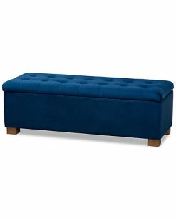 - Design details: Perfect as a bed end bench for your bedroom or as an accent piece in your living space, the Roanoke storage bench combines handy seating and storage in a stylish way. Constructed from rubberwood, the bench features a cushioned seat upholstered in a soft velvet fabric that adds a dose of glamour to your space. The elegant grid-tufted top opens to reveal ample storage space, while walnut brown legs create a strong foundation. The Roanoke storage bench is made in Malaysia and requires leg assembly.