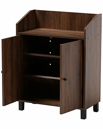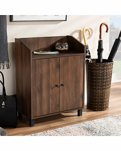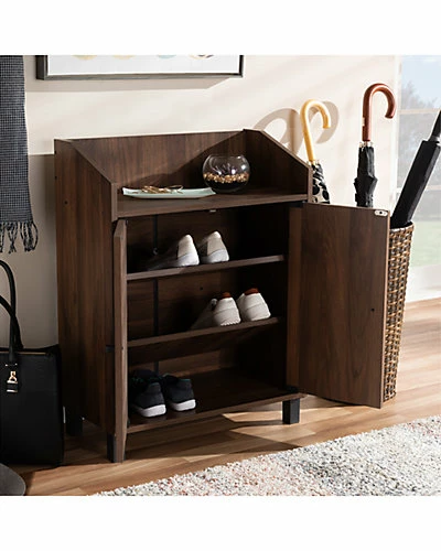 - Design details: Keep your entryway free of shoe clutter with the Rossin cabinet. Featuring a clean, contemporary design, this engineered wood cabinet is made for the modern home. Two doors conceal two tilted shelves and one straight shelf with storage space for up to 8 pairs of shoes. Additional shoe storage is provided by an open shelf on the top of the cabinet. Circular cut-outs on the back of the cabinet enable air circulation and prevent mold growth on your shoes. Dark-brown finished PVC legs and door knobs complete the look. The Rossin cabinet is made in Malaysia