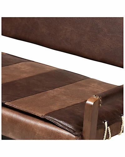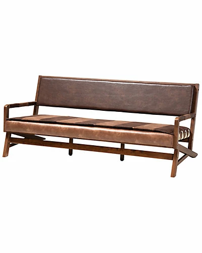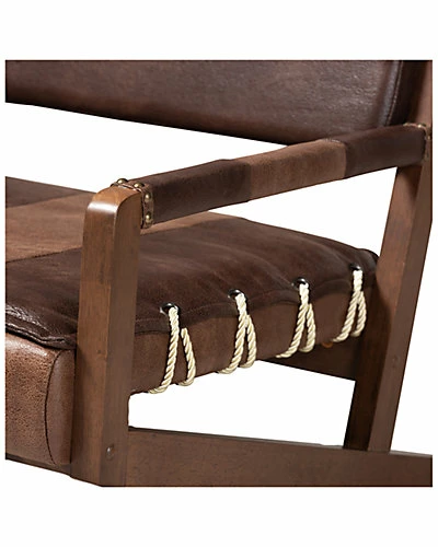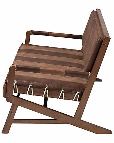- Design details: Clean lines are paired with rustic faux leather and rope to give the Rovelyn sofa an aged yet refined appeal. Constructed from solid rubberwood, the Rovelyn displays a warm walnut brown finish. Two-tone dark brown and light brown cracked faux leather upholstery is threaded with rope to convey rugged nautical charm. Brass nailhead trim on the arms adds a decorative touch. Inspired by mid-century modern silhouettes, the Rovelyn features an angled back and legs for both style and comfort. A cool addition to both private residences and public reception spaces, the Rovelyn is sure to revitalize any space. The Rovelyn sofa is made in Malaysia
