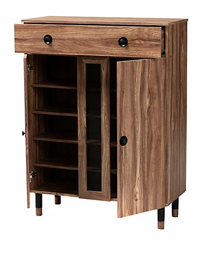 - Design details: Keep your entryway organized with the Valine shoe storage cabinet. Two doors conceal five shelves with storage space for multiple pairs of shoes. Store keys, extra shoelaces, and more in the drawer located at the top of the cabinet. A screen insert in the middle of the cabinet permits ventilation to deter shoe odor buildup. The cabinet is supported by sturdy two-tone black plastic and solid wood legs. Black plastic knobs add a sleek touch. Constructed with an engineered wood frame, the Valine showcases an oak finish that displays the natural grain patterns in the wood, giving the cabinet a rustic touch. The Valine shoe storage cabinet is made in Malaysia