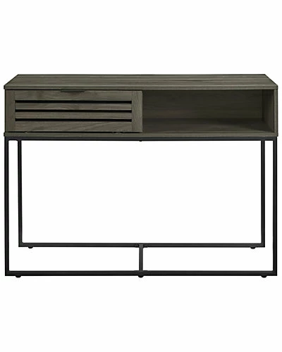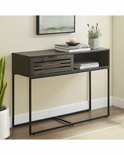 - Design details: This entry table has the best of both worlds when it comes to storage. Half is an open cubby while the other half is covered by a slatted drop-down door. This long accent table has a unique powder-coated metal base that complements the boxy silhouette of the top compartment. Round out this modern slat door collection by pairing this sofa table with its matching, side table, TV stand, or coffee table.