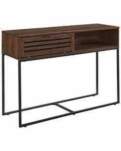 - Design details: This entry table has the best of both worlds when it comes to storage. Half is an open cubby while the other half is covered by a slatted drop-down door. This long accent table has a unique powder-coated metal base that complements the boxy silhouette of the top compartment. Round out this modern slat door collection by pairing this sofa table with its matching, side table, TV stand, or coffee table.