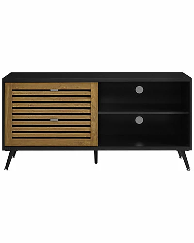 - Design details: This openly designed TV stand packs a punch in its compact footprint and trendy construction. With four spacious shelves, a slatted sliding door, with a mid-century modern vibe, the simplicity will take your home decor to the next level. Angled metal legs hold the structure up in style. This entertainment center is crafted from manufactured wood for durability. Cable management features in the back make it easy for you to manage your cords and wires from your electronic devices, so you can enjoy watching movies on your TV in your living room without a messy setup.