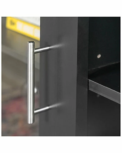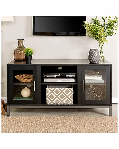 - Design details: Showcase your decor in modern style and find the perfect home for your TV with this 52-inch TV stand. Featuring a gorgeous painted finish and sleek metal legs, this contemporary console also includes cable management holes to help keep your entertaining space tidy and clutter-free. Use the open shelving to store your electronic devices and adjustable shelving behind tempered glass doors to organize your collectibles and media accessories. This entertainment center will look sleek in your living room with its subtle metal details.