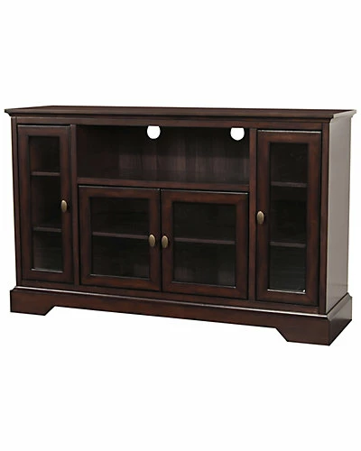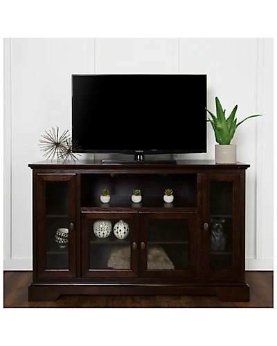 - Design details: Give a transitional feel into your living room with this highboy console. This console is a practical piece ideal for storing room essentials, from your movies to your books and decor, as it has open and closed shelving. Functioning as a TV stand and entertainment center, this media console can accommodate most flat panel TVs up to 55 inches and has a cable management feature in the back for a tidy appearance. Side and middle cabinets feature adjustable shelving so you can easily fit your items inside, with tempered glass doors for a stylish look.