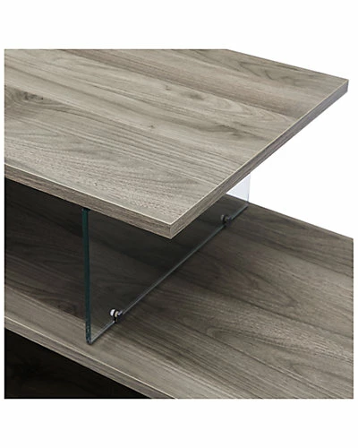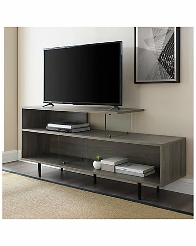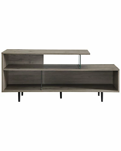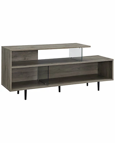 - Design details: Hip and asymmetrical this mixed material TV stand is ready to take your entertainment to the next level. Mid-century modern inspired, this console has a groovy vibe that will easily display your books, plants, or vinyl records. This storage console has tempered glass shelf supports that help divide and organize the space in this piece. Cord management is also included in this 60 media stand and can accommodate TVs up to 66-inches.