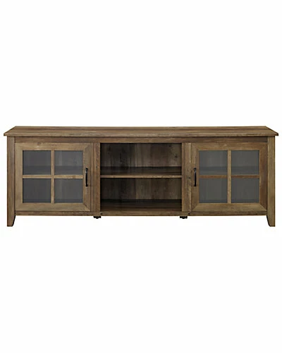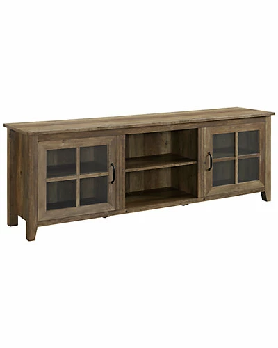 - Design details: Showcasing window pane cabinet doors, this 70-inch TV stand has a stylish farmhouse appeal. With a high-grade MDF, durable laminate, tempered safety glass, and metal construction for a solid and sturdy design for storing your media, electronics, and more. Display decor or your book collection behind the glass pane doors with your electronics on the center open shelving. Including cord management and adjustable shelving for an easy fit for all of your items. This transitional and traditional entertainment center can hold up to a 78-inch TV for your living room or be used as a storage console in your bedroom for extra blankets, pillows, jackets, and shoes.