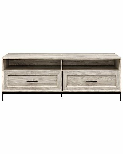 - Movie nights have never felt more right than with your 60 TV sitting atop this modern console. Cozy up and enjoy your favorite flicks with enough room to store all of your media consoles, DVDs, gaming systems, or streaming devices within the two open cubbies and two drawers. Put your display-worthy decor on debut within the open cubbies, or use them to house your media and feed your cables through the cord management ports for an ultra-clean look. With a modern build, minimalist black hardware, and a classic silhouette fit for storage, this TV stand will help your living room will look as instantly refreshed as youll feel after a good series binge sesh.