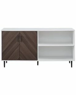 - Enjoy watching movies in the comfort of your own home with this TV stand. Making an ideal entertainment center by having open and closed storage in an asymmetrical design. Bookmatched styled cabinet doors give a visually interesting element to this entertainment center. With a flattering two-tone surface made from durable laminate and metal angled legs. This media console will give your living room a mid century modern flair youll love.