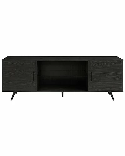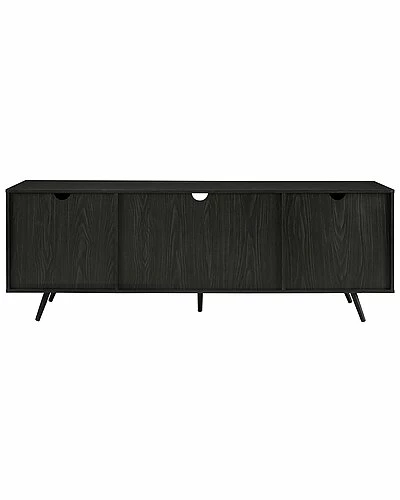 - Take your living room to the next level with this stylish 70 inch TV stand. Made with metal tapered legs, sleek metal handles, and a center glass shelf for a mid century modern appearance. This warp-resistant MDF entertainment center creates additional storage space in your home for media, electronics, accessories, books, or decor. Use as a TV stand in your living room, a storage cabinet in your bedroom, or a buffet in your kitchen or dining room. Including two side cabinets for closed storage space and center open shelving. Can accomodate up to an 80 inch TV.