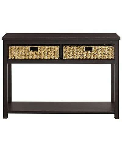 - Clear your cluttered hallway with this mission-style entryway table. The rattan baskets provide an easy organizational tool for keys, bags, hats, mail, or whatever else you need to tuck out of sight. The lower shelf provides the perfect location for cheery seasonal decor or your favorite shoes. You can trust the warp-resistant MDF wood and durable laminate build for its long-lasting quality. Pair with the matching side and coffee tables for a complete, rustic set.