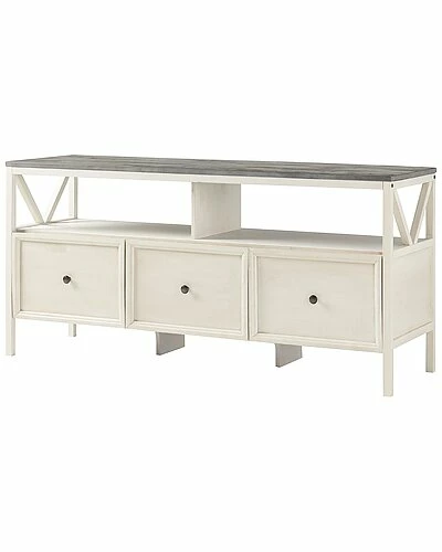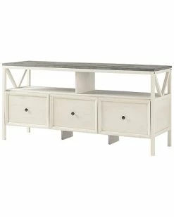 - Implement a sense of family in your home with signs of Gather and Live, Laugh, Love displayed on this farmhouse TV stand. The attractive side V accents add an extra rustic touch to the two-tone design. Place your TV up to 65 inches on the top and host the family for watch parties. They will love the three, easy-open, large drawers which hold games, blankets, and movies. The open display space provides the perfect spot for a sound bar, so everyone can enjoy the gatherings in your living room.
