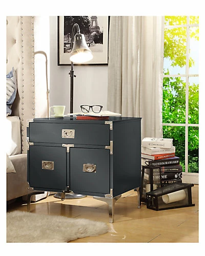 - Design details: MDF construction; lacquer finish; chrome legs; one drawer; two door compartments; decorative corner brackets; silver pull; doors feature a soft close mechanism