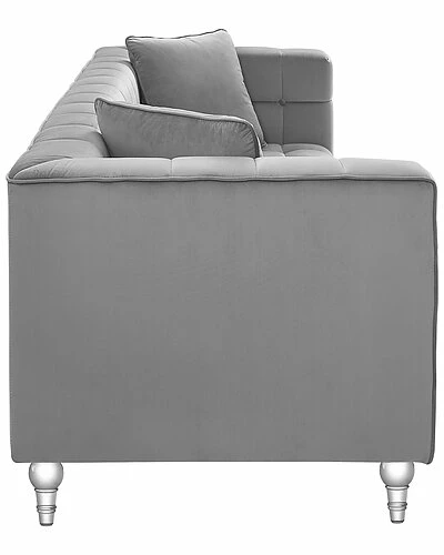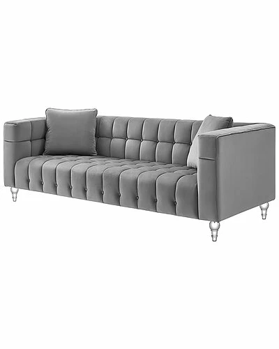 - Choosing the right piece for your home can instantly transform a dull room into a spectacular one. Blending traditional design with a touch of contemporary flair, this sofa is a perfect finishing touch to create a dynamic and cozy interior home space. Straight lines, square arms, soft velvet handmade upholstery, biscuit button tufting and clear acrylic legs makes a brilliant combination for a perfect modern statement piece. Frame is made of combined solid wood and manufactured wood, which makes construction to be firm and stable, and sinuous springs give a nice support as you sit.