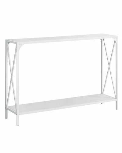 - Design details: Made from MDF, metal; Minimalist contemporary design in a fresh white finish; Strong metal framing with attractive cross-bars accent at both ends; Spacious laminated MDF white table top and bottom shelf for decorative objects, books, storage; Multi-functional accent table for entryway, hallway, living room, or home office; Easy to assemble with full instructions included