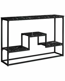 - Proudly display prized possessions on this rectangular console table with multi-tier shelving. Underneath the long, narrow tabletop are 3 shelves arranged on 2 levels, similar to an award podium: The center storage shelf rises above the 2 side storage shelves. Distribute books, plants, and decorative items among the tabletop and shelves, which are in an alluring black marble-look finish. The sturdy metal base in a coordinating black finish features clean lines and right angles for a modern look. With its narrow profile and generous display space, this versatile accent table with storage is ideal for a hallway, an entryway, or behind a sofa in a living room.