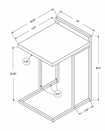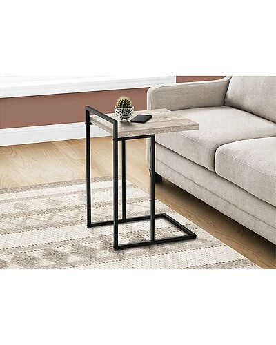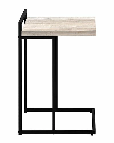 - This C-shaped accent table brings something extra to the table. The thick-panel tabletop in a taupe reclaimed wood-look finish offers a wider surface than most standard-size C tables. More surface space gives you more opportunities to use this end table. It can multitask in a living room or bedroom as a snack table when you watch TV, a nightstand to place a mobile phone while you sleep, or even a small laptop table when you need to work. The black metal base slides under a sofa or bed to bring items closer to you and offers another convenient feature: The top of the frame extends over the tabletop to create a handle that makes it easier to lift and move this portable side table.