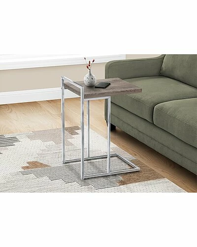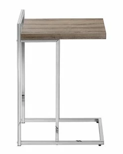 - This C-shaped accent table brings something extra to the table. The thick-panel tabletop in a dark taupe wood-look finish offers a wider surface than most standard-size C tables. More surface space gives you more opportunities to use this end table. It can multitask in a living room or bedroom as a snack table when you watch TV, a nightstand to place a mobile phone while you sleep, or even a small laptop table when you need to work. The chrome metal base slides under a sofa or bed to bring items closer to you and offers another convenient feature: The top of the frame extends over the tabletop to create a handle that makes it easier to lift and move this portable side table.