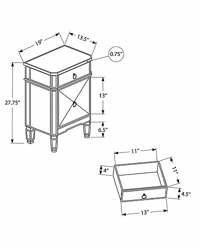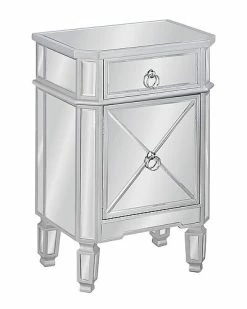 - This mirrored accent table has a glamourous look that is always in style. Mirror insets on the top, front, sides, and tapered feet are bordered by a shimmering silver finish. The mirrored surfaces reflect light and the surrounding decor to blend beautifully in a living room or bedroom and make the room appear bigger. Adding to its elegance are silver metal ring pulls, clipped front corners, and sculpturesque block feet. The storage drawer is lined with black fabric and includes a stopper to help prevent it from falling when opened. Concealed by a door with X-shaped beveling is a spacious, silver-finished cabinet. Use this side table or nightstand to bring glam style to any room.