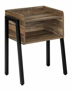 - With this accent table, you’ll have storage and style by your side. Placed beside a sofa, chair, or bed in a living room or bedroom, this versatile end table or nightstand with storage provides convenient surfaces for keeping items within reach. Place a small lamp and mobile devices on the tabletop that has a tray-like style with raised edges along the sides and back to help prevent items from rolling off the surface. Underneath is a wide, deep storage cubby that offers a place for a box of tissues or a stack of books. The top of the table is in a brown reclaimed wood-look finish with a slight texture and is supported by thick black metal legs that are exposed for a modern-industrial look.